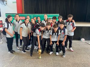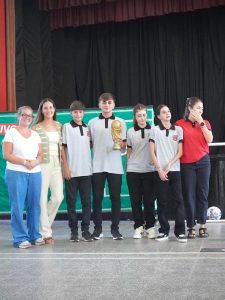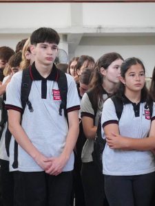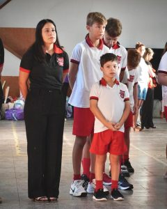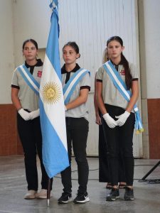 Por la tarde fue el turno para los alumnos del Nivel Secundario. Este acto conducido por dos docentes, se inició con una introducción, la presentación de autoridades y el ingreso de la bandera de ceremonia del nivel, portada por los alumnos que alcanzaron el mejor promedio de notas en el ciclo lectivo anterior: Frida Sacavino, Esperanza Chicco y Magdalena García Dalmazzo. El hilo argumental seguido en el guion, acompañado por una escenificación acorde, se basó simbólicamente en lo que será la disputa del mundial de fútbol 2026. Se emuló un estadio, para iniciar el llamado “Mundial del Aprendizaje”. Se saludó a los estudiantes de 2º, 3º y 4º año, quienes ya estaban dispuestos en el lugar asignado en el salón tomaron la ubicación asignada. La presentación de los nuevos alumnos de primer año, fue muy especial, porque pasaron por “la manga” de la cual salen los jugadores al estadio, poniéndose en la piel del nuevo equipo del IECS. Ingresaron escoltados por su preceptora, Prof. Araceli Rivero.