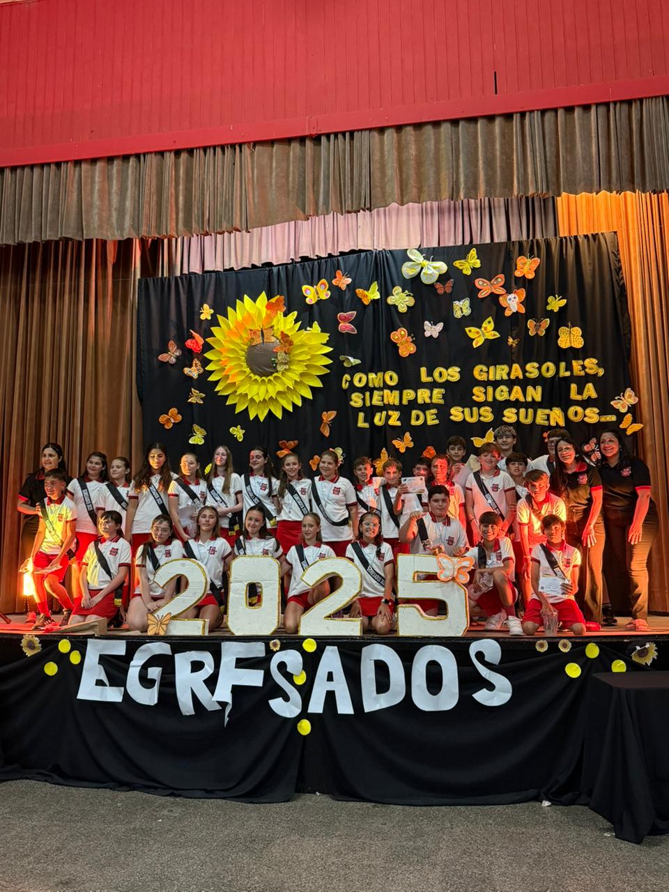 Los egresaditos, que son numerosos (42 estudiantes), corresponden a las dos salas de cinco años en que se componen (la roja y la negra), fueron los destacados destinatarios de la programación del acto alusivo y nos ofrecieron una colorida postal, desde que hicieron su ingreso.