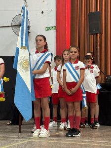 Bandera Nacional Argentina. Abanderada: Emilia Beltramo, escoltas: Simona García y Lucía Pairazzo.