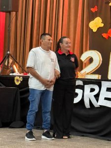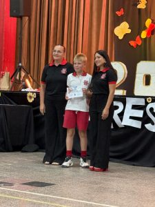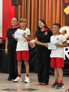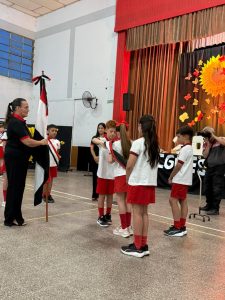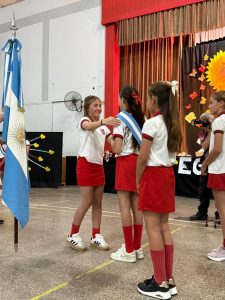Tras el cambio de los portantes de la enseña provincial, se destacó al alumno Pedro Tiranti Cavic por sus valores demostrado en el ciclo 2025. Representante legal y directora se ocuparon de tal distinción.