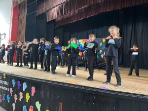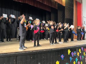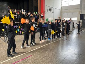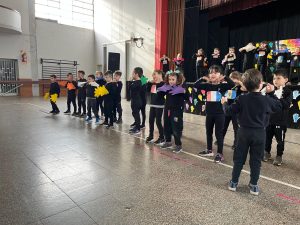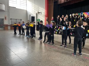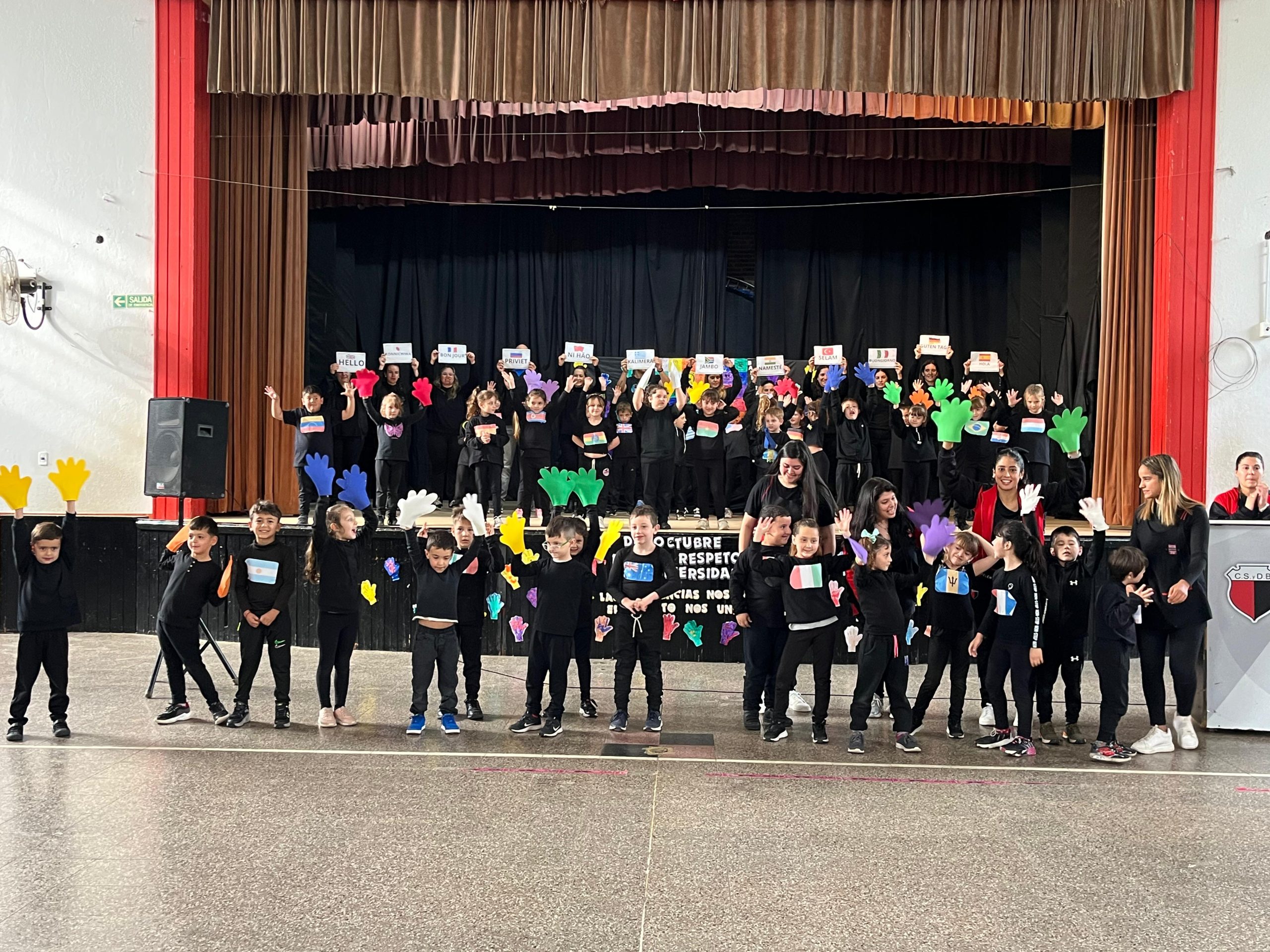 Luego, tras el retiro de las banderas, los alumnos de la sala de cinco y de primer grado teatralizaron una canción titulada “Si eres feliz y lo sabes”, con la guía de las docentes de inglés. La idea fue reflejar el mundo cultural de los pueblos originarios que, más allá de la diversidad, resulta común a todas las culturas la presencia de diversas manifestaciones artísticas, que ponen de manifiesto su visión del mundo, de los lugares en los viven, de su origen y sus creencias, y de la forma en que organizan sus sociedades. Terminó la función con la aparición de los padres de los educandos de sala de cinco, con pancartas que contenían la palabra “hola”, en distintos idiomas.