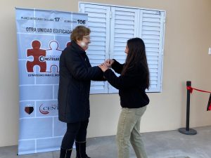 Tras el discurso de Díaz, la arquitecta Agostina Scotta le entregó a la titular las llaves de la nueva casa culminada. Toda la representación de la entidad, junto a la adjudicataria y su esposo, procedieron al corte simbólico de cinta, finalizando así la parte protocolar.
