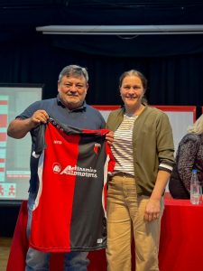 Destacó que continúa integrando el consejo directivo, pero ya en un cargo menos relevante y le deseó al nuevo presidente, Ariel Bosio, que tenga una buena gestión junto a todo el equipo dirigencial. Tras sus palabras, la presidente del club Centro Social, Méd, Vet. Anabel Ferrero, a modo de agradecimiento por la contribución de la mutual al sostenimiento del club, le entregó una camiseta rojinegra, que simbolizan los colores distintivos de toda la familia institucional.